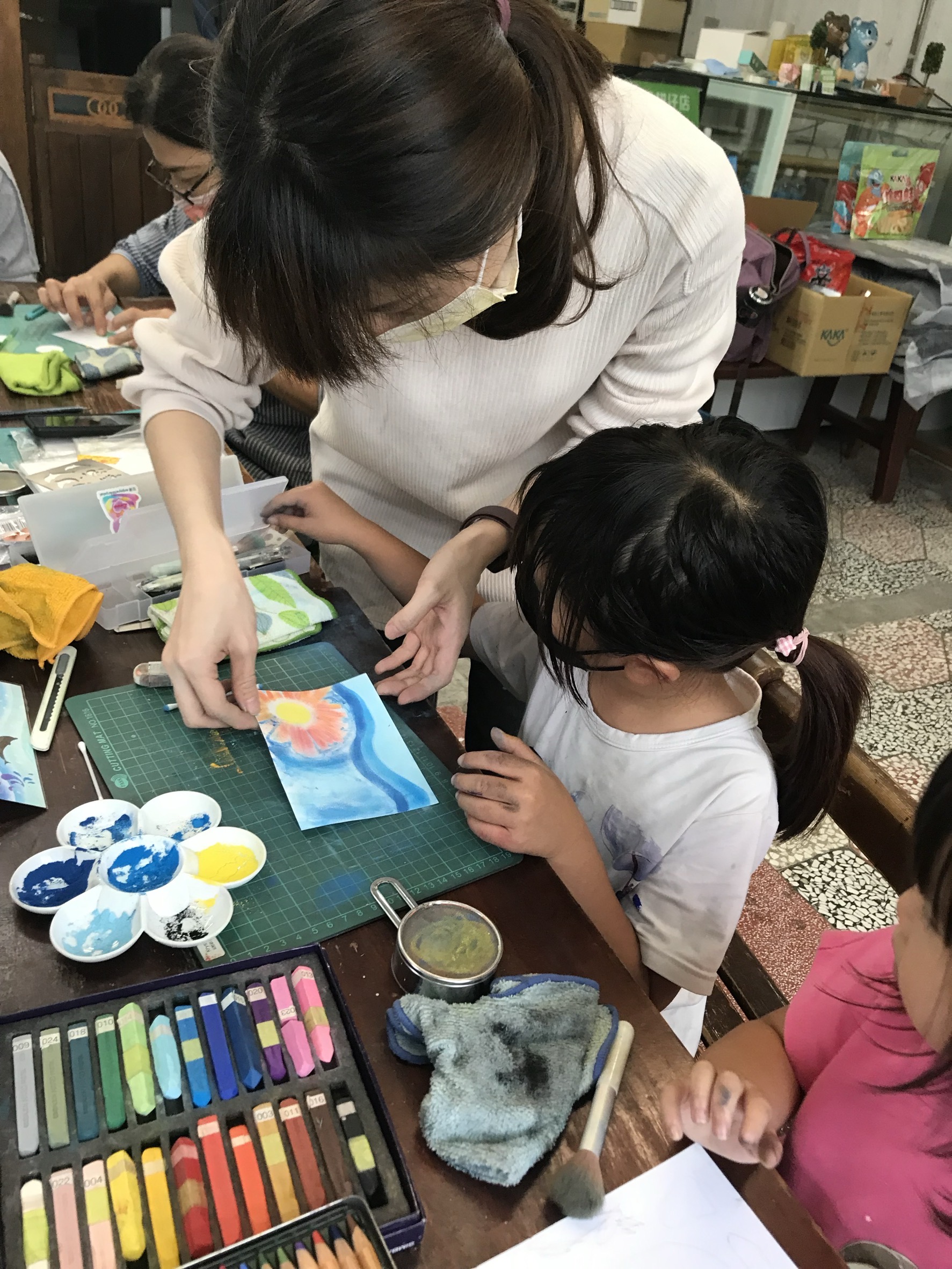 有次安排畫親子玩粉彩,找了Krystal’s玩粉彩的婉君老師。當時找租借場地時,問了幾個地方費用都不便宜,想到朋友之前辦活動有跟「媽媽號」借場地,所以我也去詢問「媽媽號」可否在非營業時間租借場地給我們?